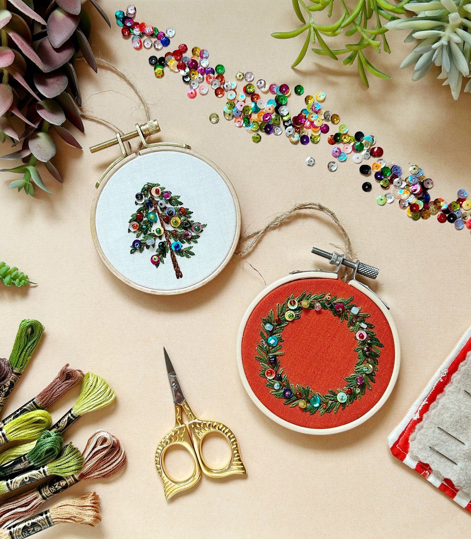 Add some sparkle to your ornaments this year! Trim your tree with a bedazzled holiday Christmas tree ornament. Learn how to embroider a beginner-friendly tree, then make it your own with beads and sequins. This botanical embroidery kit is the perfect project to create a custom ornament for the holidays in under a few hours.